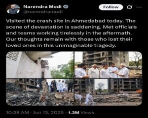 पीएम मोदी ने एक्स पर कहा, ‘आज अहमदाबाद में दुर्घटना स्थल का दौरा किया। तबाही का मंजर दुखद है। अधिकारियों और टीमों से मुलाकात की जो घटना के बाद अथक परिश्रम कर रहे हैं। हमारी संवेदनाएं उन लोगों के साथ हैं जिन्होंने इस अकल्पनीय त्रासदी में अपने प्रियजनों को खो दिया है।’